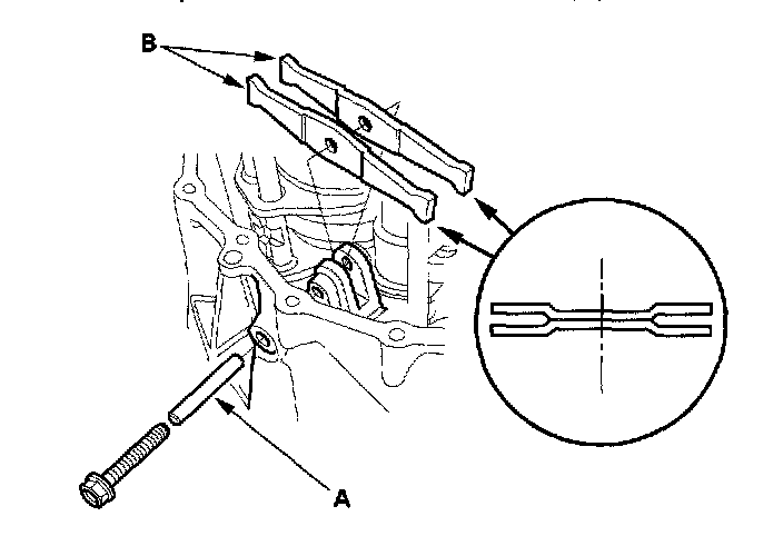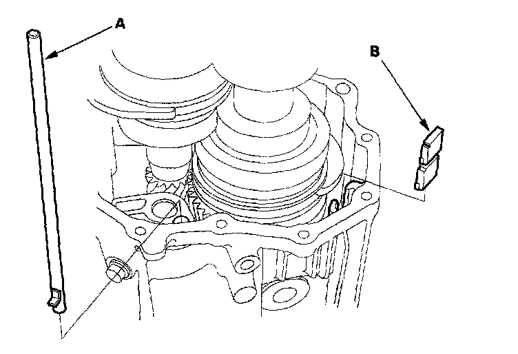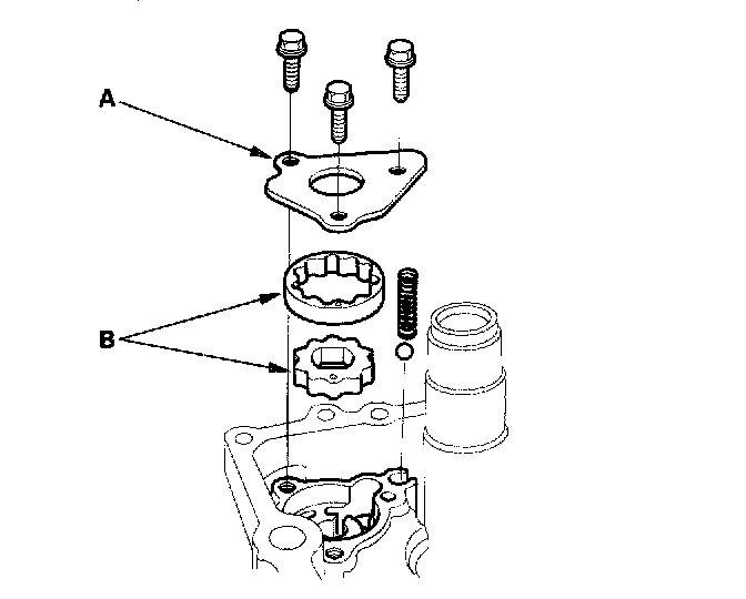 7. Remove the 6 mm flange bolts, then remove the oil pump plate (A), spring, steel ball, and oil pump rotors (B).