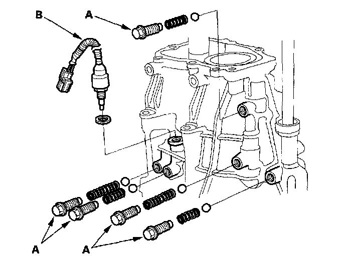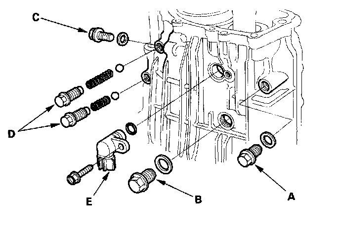 8. Remove the drain plug (A), the filler plug (B), the 12 mm drain plug (C), washers, the set screws (D), springs, steel balls, and the pick up sensor (E).