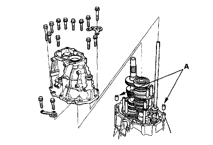 11. Remove the transmission housing and the 14 x 20 dowel pins (A).