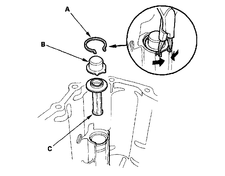 14. Remove the circlip (A), then remove the suction guide (B) and the oil pump strainer (C) from the transmission housing.