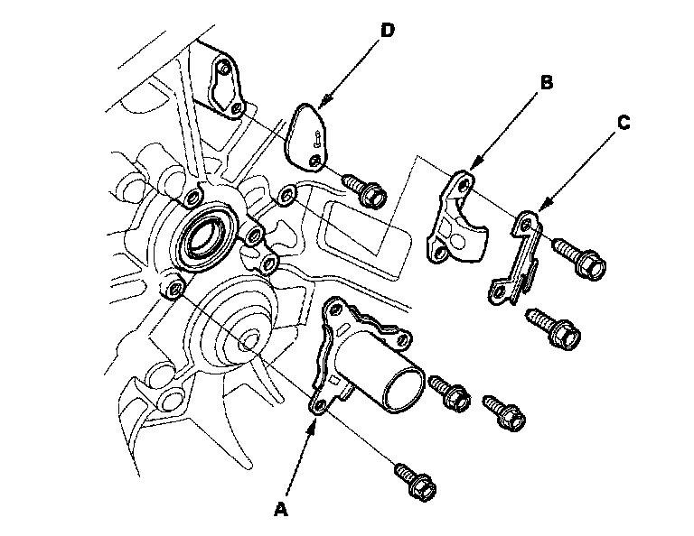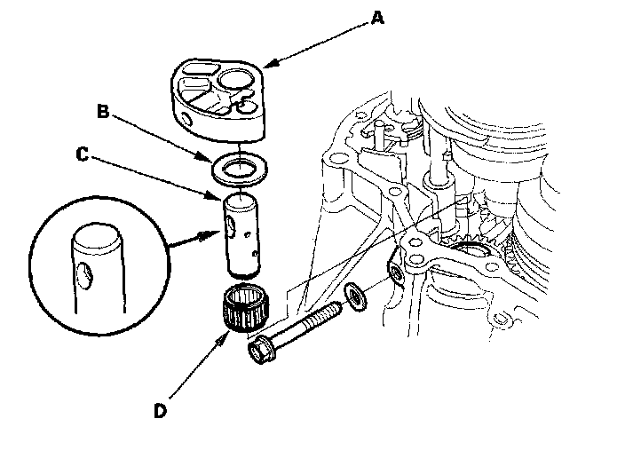 17. Remove the 8 mm flange bolt and washer, then remove the reverse shaft holder (A), the thrust washer (B), the reverse gear shaft (C), and the needle bearing (D).