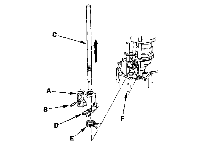 20. Remove the shift arm (A) from the interlock (D), then remove the select return spring (E) and the 8 x 40 pin (F).