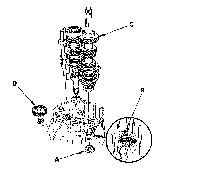 24. Remove the mainshaft, countershaft, and the shift forks assembly (C), and remove the 64 mm spring washer, the reverse idler gear (D), thrust washer.