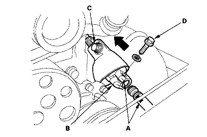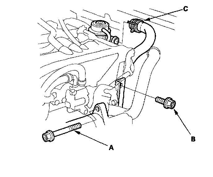 13. Remove the upper starter motor mounting bolt (A) and upper intake manifold bracket mounting bolt (B). Disconnect the hose (C) from the suction valve.