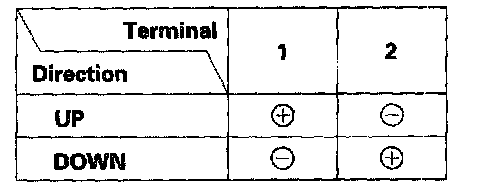 3. Check window motor operation by connecting power and ground according to the table. When the motor stops running, disconnect one lead immediately.