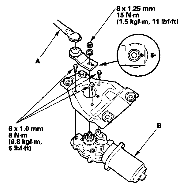 5. Remove the three mounting bolts and nut from the wiper linkage (A) to remove the wiper motor (B).