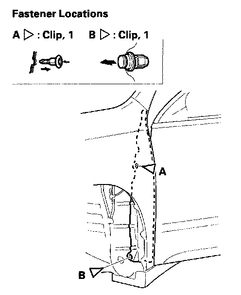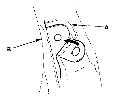 - Before installing the clips in the door opening area, install the front fender fairing (A) to the front fender (B) properly as shown.