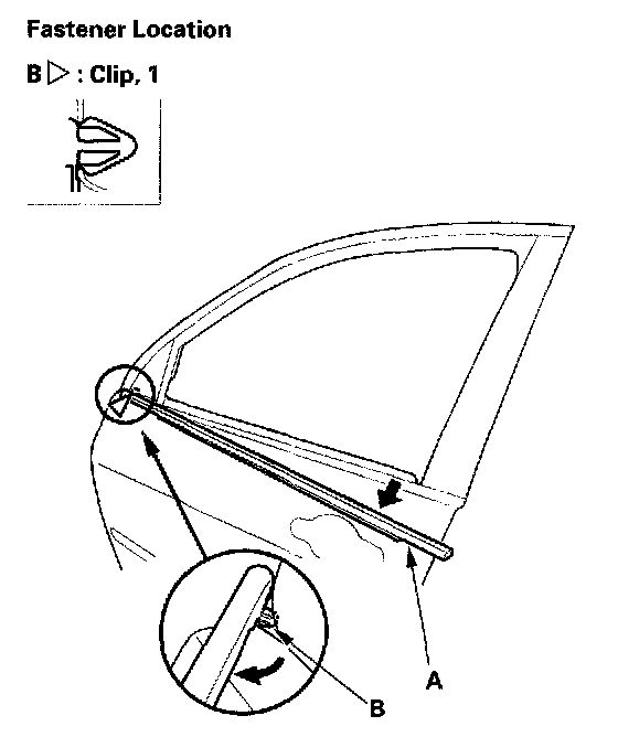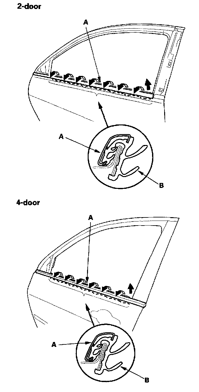 4. Pull the rear of the glass outer weatherstrip (A) away from the door, then release the front clip (B) from the mounting hole in the door. If necessary, pry the clip, then remove the weatherstrip.