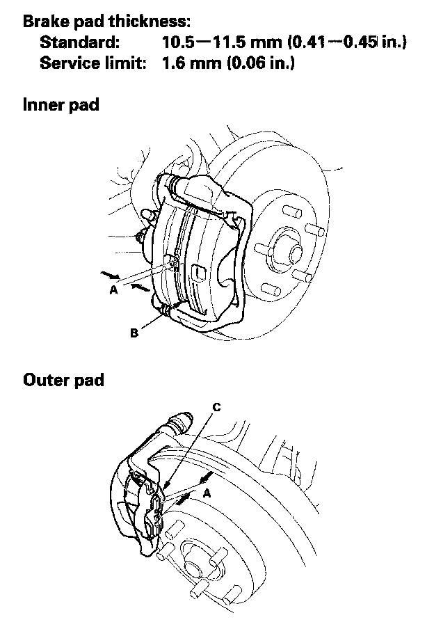 3. Check the thickness (A) of the inner pad (B) and outer pad (C). Do not include the thickness of the backing plate.