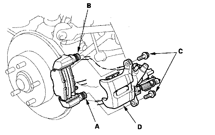 3. Remove the flange bolts (C) while holding the pin A and pin B with a wrench being careful not to damage the pin boots, and remove the caliper (D). Check the hose and pin boots for damage and deterioration.