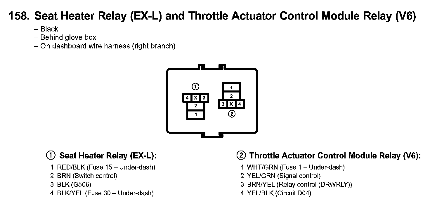 158. Seat Heater Relay (EX-L) And Throttle Actuator Control Module Relay: