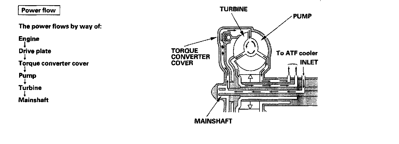 Fluid entered from the chamber between the torque converter cover and the torque converter clutch piston passes through the torque converter and goes out through the chambers between the turbine and the stator, and between the pump and the stator. As a result, the torque converter clutch piston moves away from the torque converter, and the torque converter lock-up clutch is released; torque converter clutch lock-up is OFF.