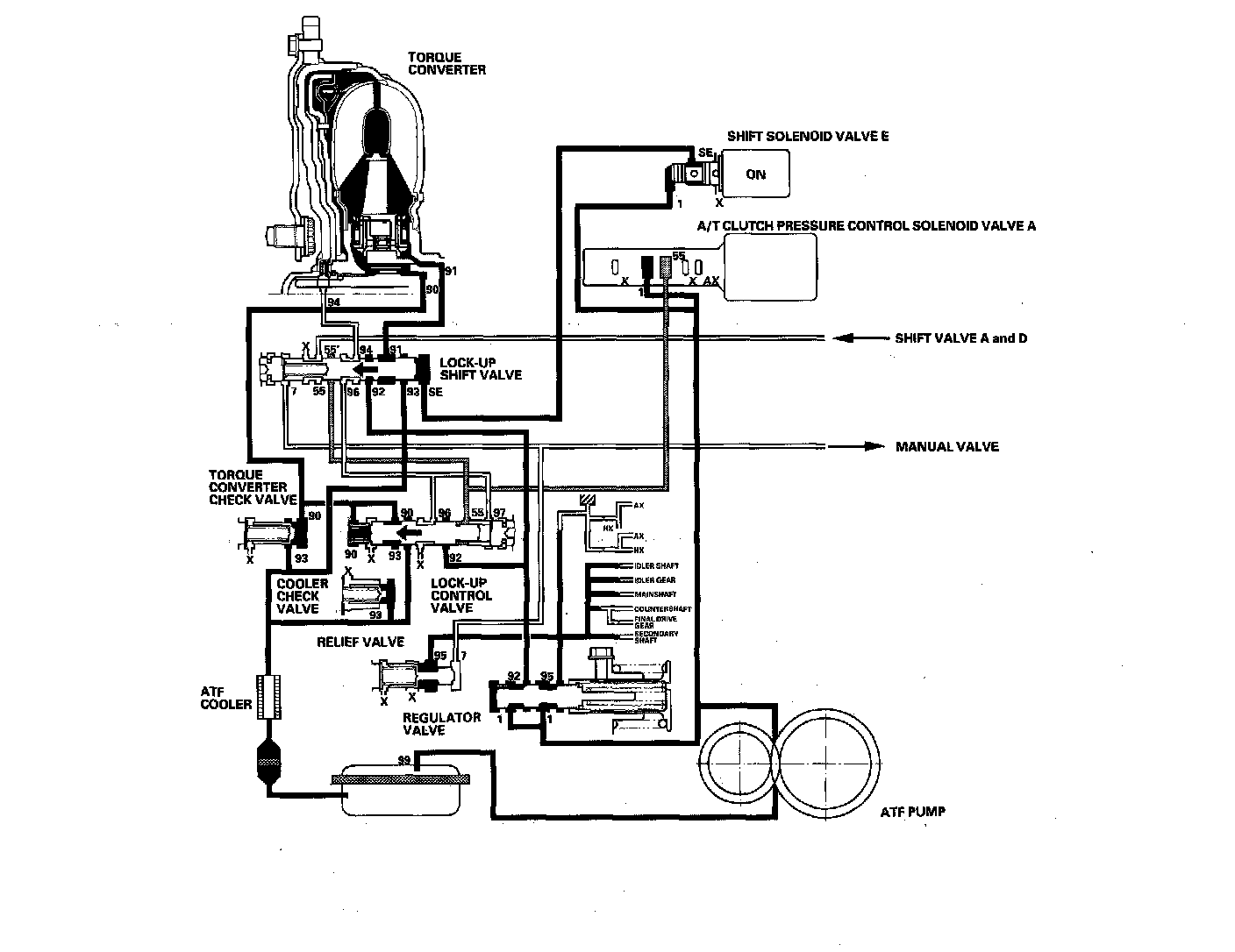 Shift solenoid valve E is turned OFF by the PCM, and shift solenoid valve E pressure (SE) is not applied to the lock-up shift valve. The lock-up shift valve stays to the right to uncover the torque converter pressure ports leading to the left side of the torque converter and releasing pressure from the right side of the torque converter. Torque converter pressure (92) changes to (94) at the lock-up shift valve, and enters into the left side of the torque converter to disengage the torque converter clutch. This keeps the torque converter clutch piston keeps away from the torque converter cover and the torque converter clutch lock-up is OFF.