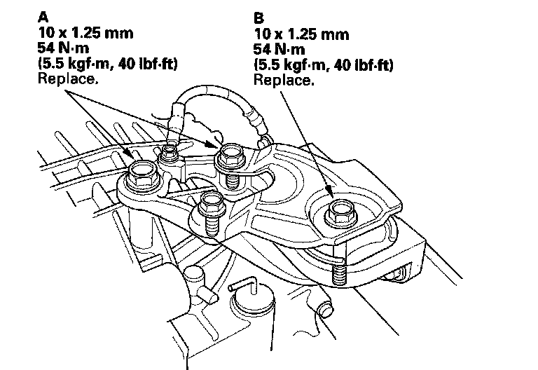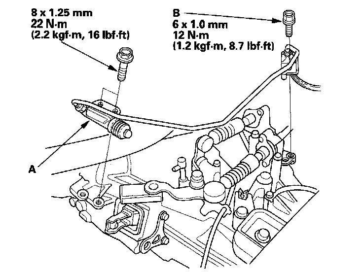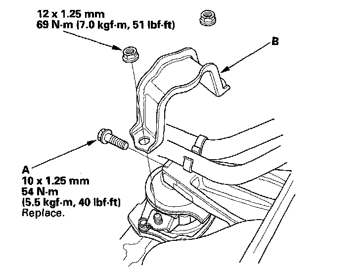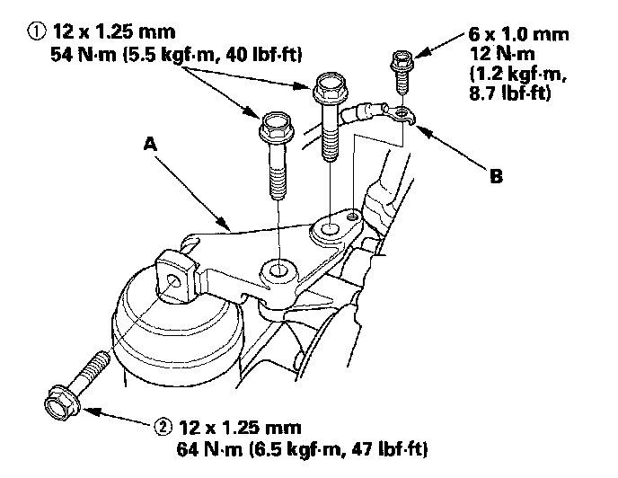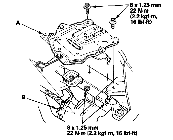 11. A/T model: Tighten the transmission upper mount bracket plate mounting bolts (A), then tighten the transmission upper mount bolt (B).