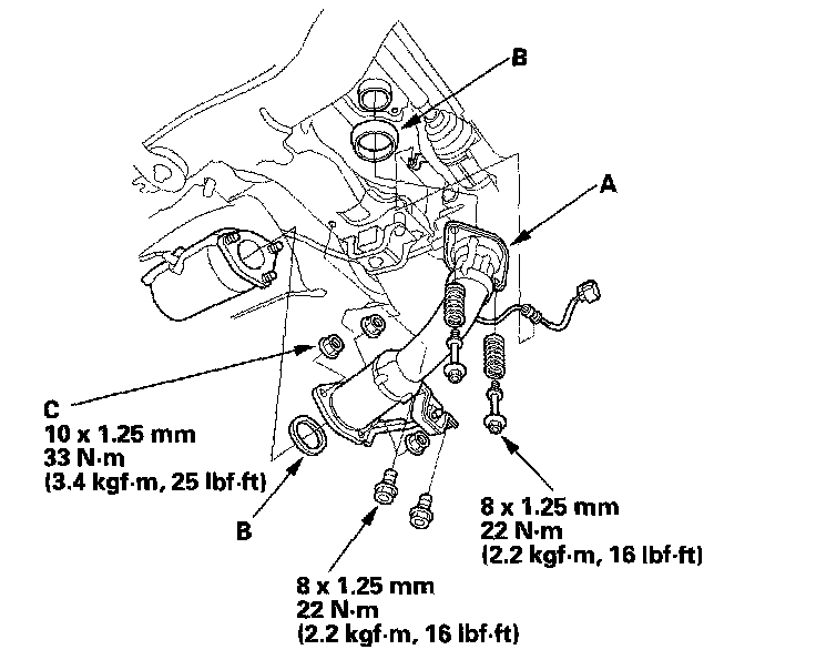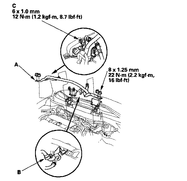 4. A/T model: Tighten the front mount bolt (A), then install the front mount stop (B) and vacuum hose clamp bracket (C). Install vacuum hose (D).