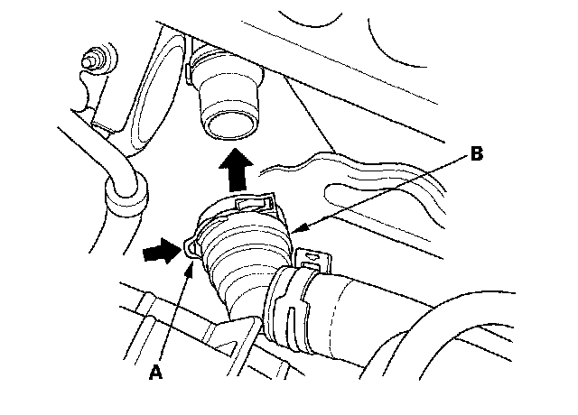 27. Push down the lock (A), then push the quick connector (B) onto the thermostat cover until you hear it click.