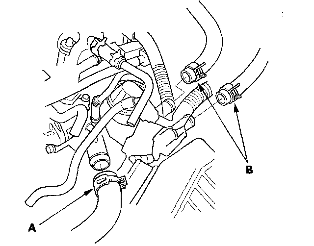 28. Install the upper radiator hose (A) and heater hoses (B).