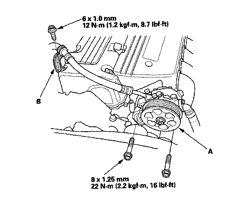 31. Install the power steering (P/S) pump (A), and the P/S hose clamp (B).