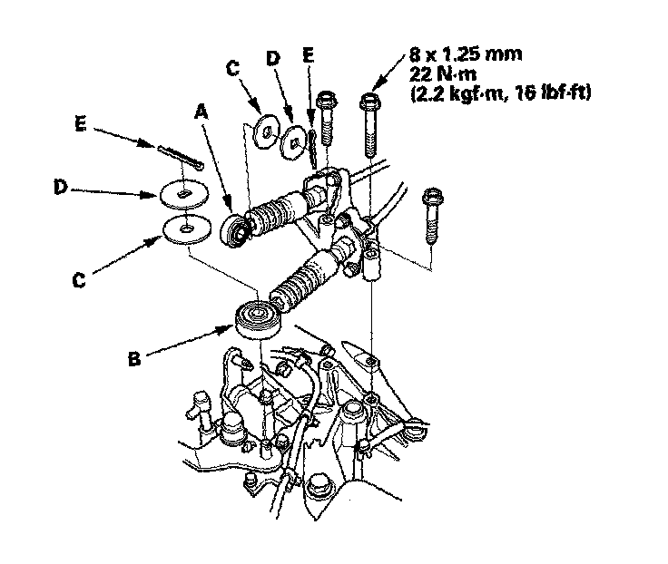 34. M/T model: Install the select cable (A) and shift cable (B) with the plastic washers (C), washers (D), and new cotter pins (E).