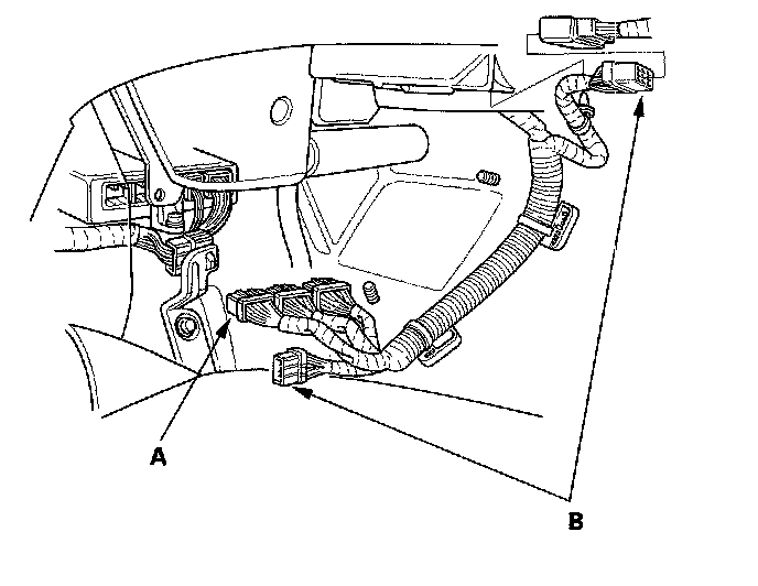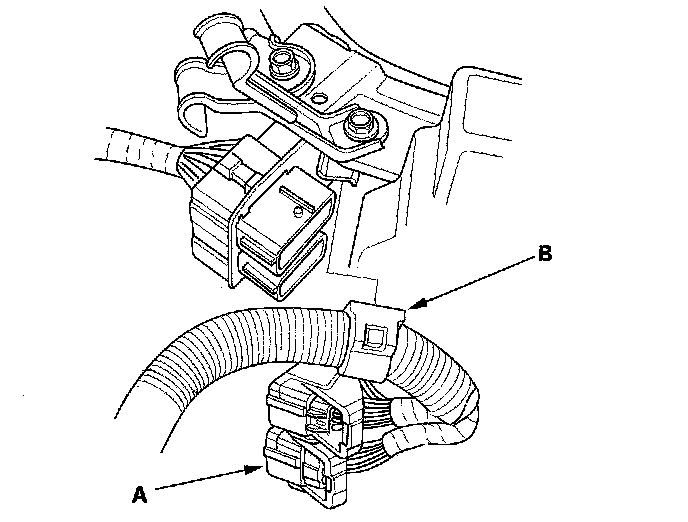 39. 2006-2007 models: Connect the ECM/PCM connectors (A) and main wire harness connectors (B).