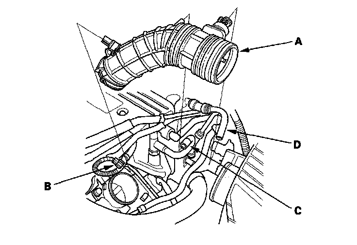 49. Install the intake air duct (A), then connect the intake air temperature (IAT) sensor connector (B), and install the vacuum hose (C) and breather pipe (D).