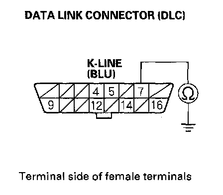 9. Check for continuity between DLC terminal No.7 and body ground.