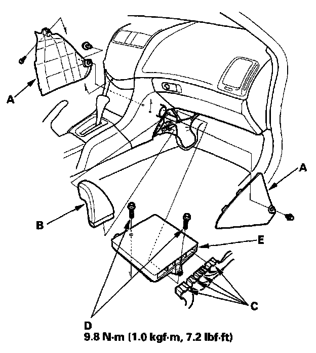 5. Remove the bolts (D), then remove the ECM/PCM (E).