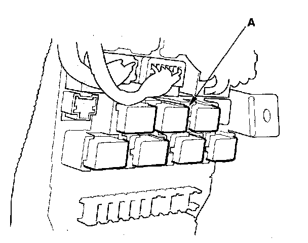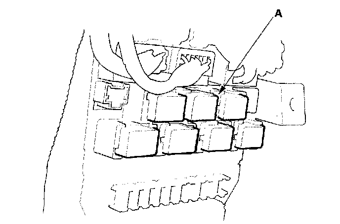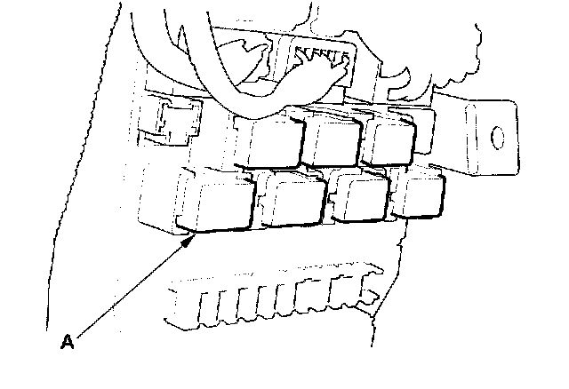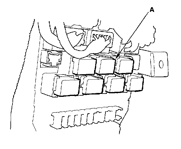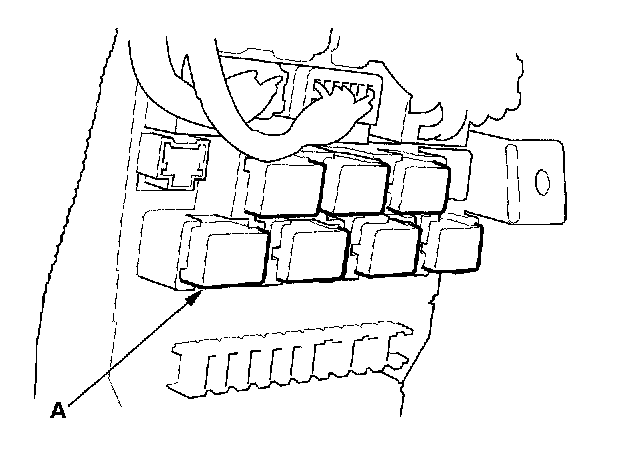 36. Remove the left kick panel; 2-door, 4-door; then remove PGM-FI main relay 2 (FUEL PUMP) (A) from the under hood fuse/relay box.