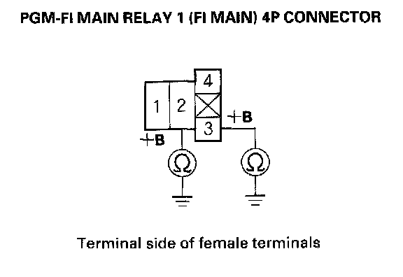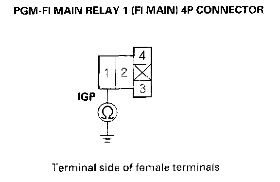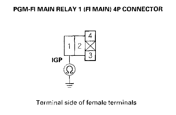27. Check for continuity between body ground and PGM-FI main relay 1 (F1 MAIN) 4P connector terminals No.2 and No.3 individually.