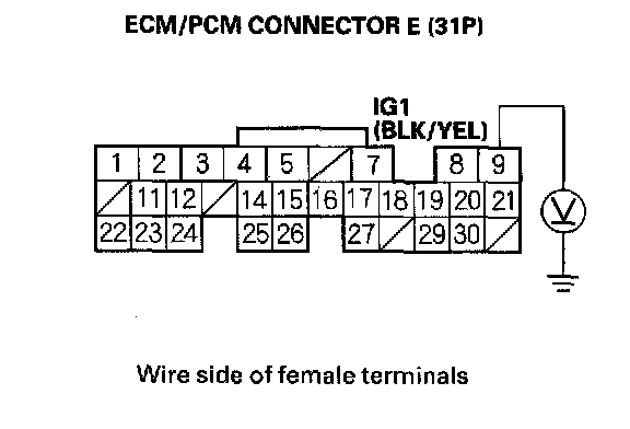 47. Measure voltage between ECM/PCM connector terminal E9 and body ground.