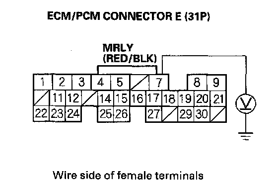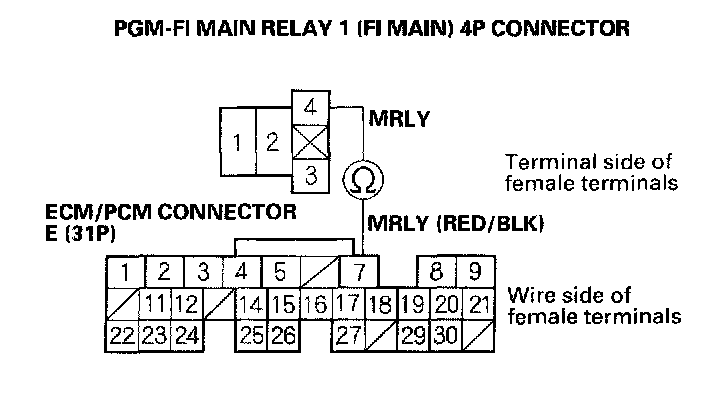 30. Check for continuity between PGM-FI main relay 1 (FI MAIN) 4P connector terminal No.1 and body ground.