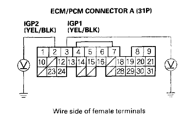 55. Measure voltage between body ground and ECM/PCM connector terminals A2 and A3 individually.