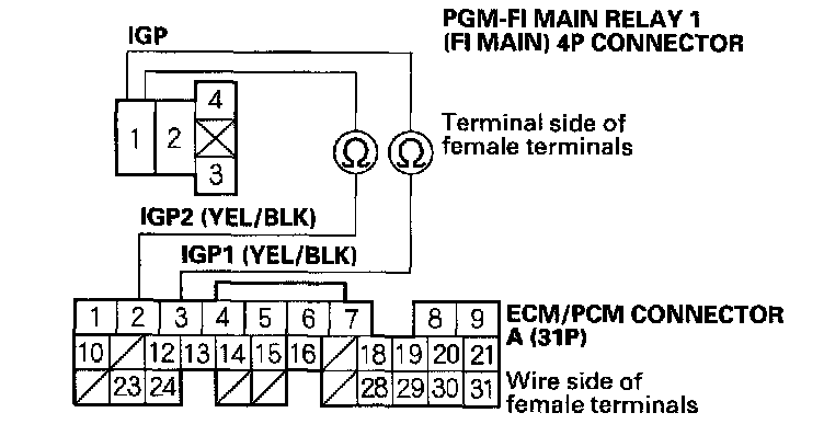 61. Check for continuity between PGM-FI main relay 1 (FI MAIN) 4P connector terminal No.1 and ECM/PCM connector terminals A2 and A3 individually.