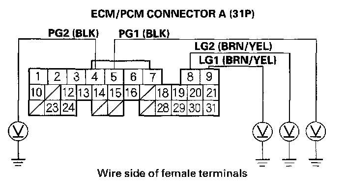 62. Measure voltage between body ground and ECM/PCM connector terminals A4, A5, A8, and A9 individually.