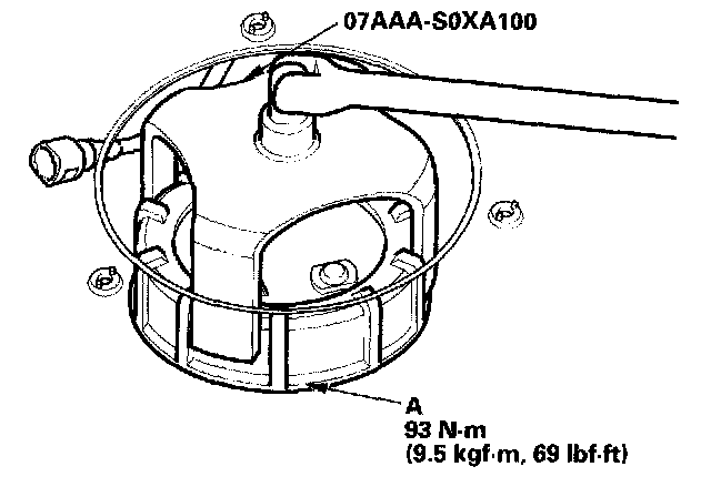 7. Using the special tool, loosen the fuel tank unit locknut (A).