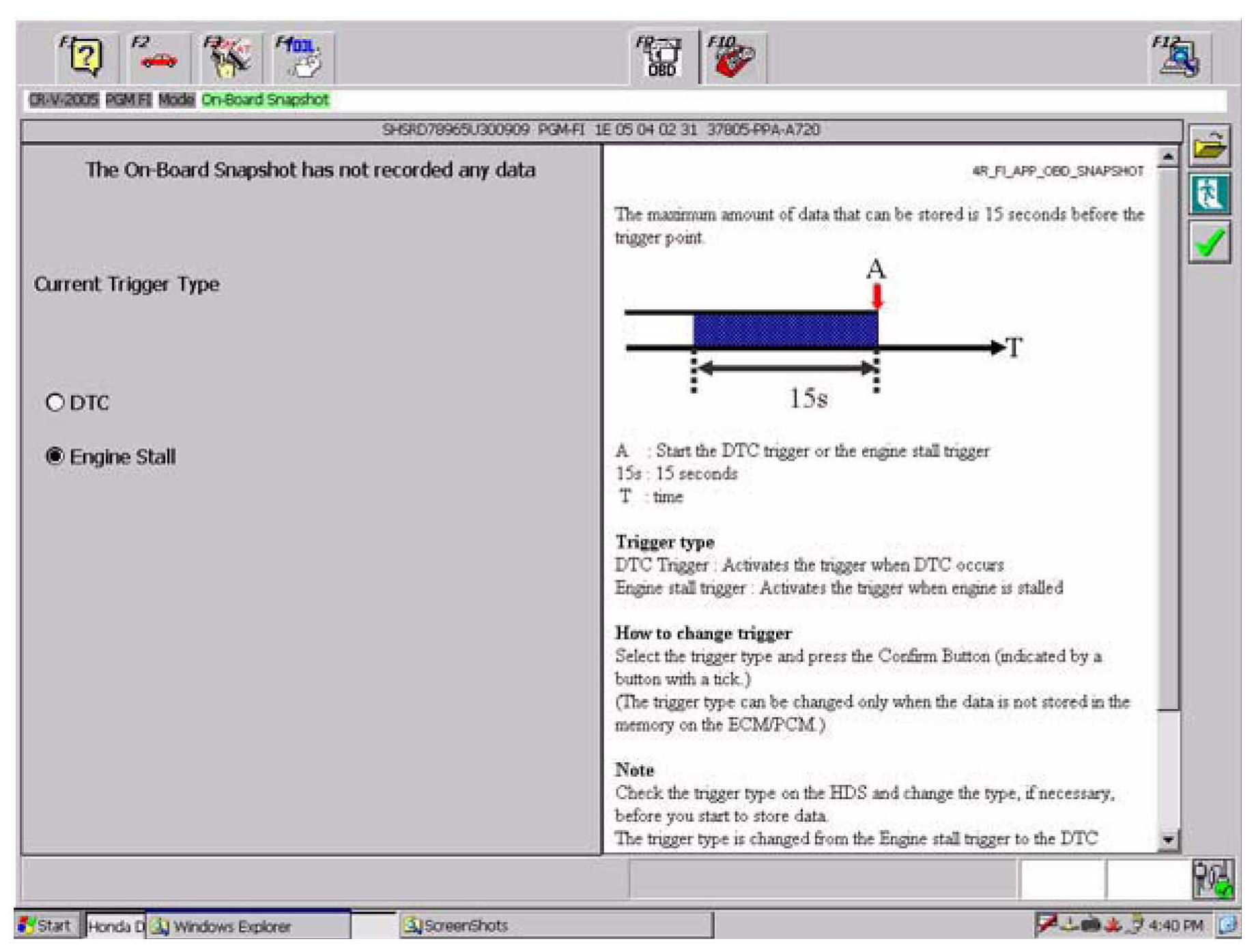 5. From the Mode Menu, select On-Board Snapshot. If the ECM/PCM has data from a earlier DTC, the HDS will download and store it. After the download is finished, you can then change the trigger type.