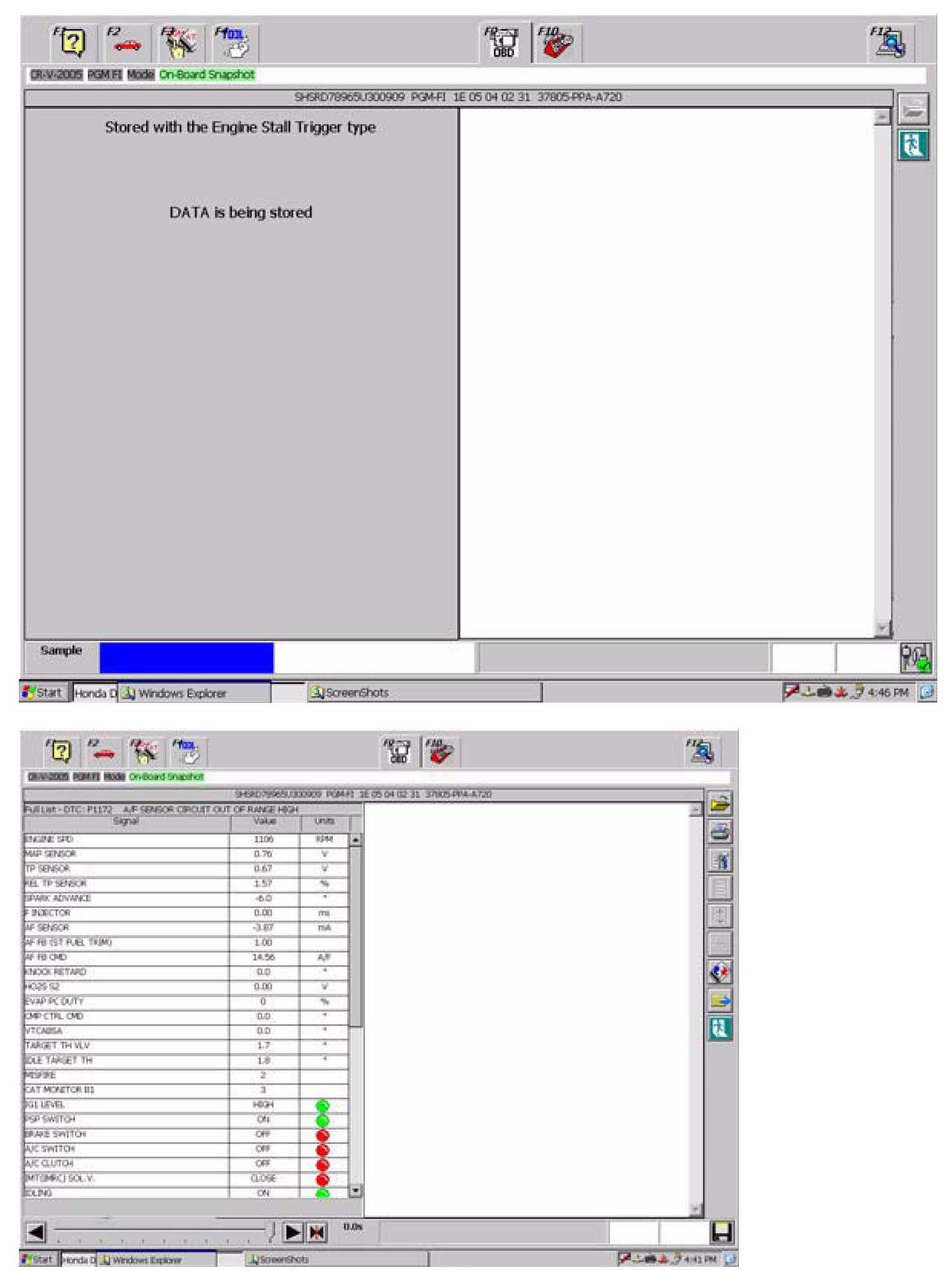 4. From the Mode Menu, select On-Board Snapshot. The HDS automatically downloads the data stored in the FCM/PCM and shows it on the display screen: