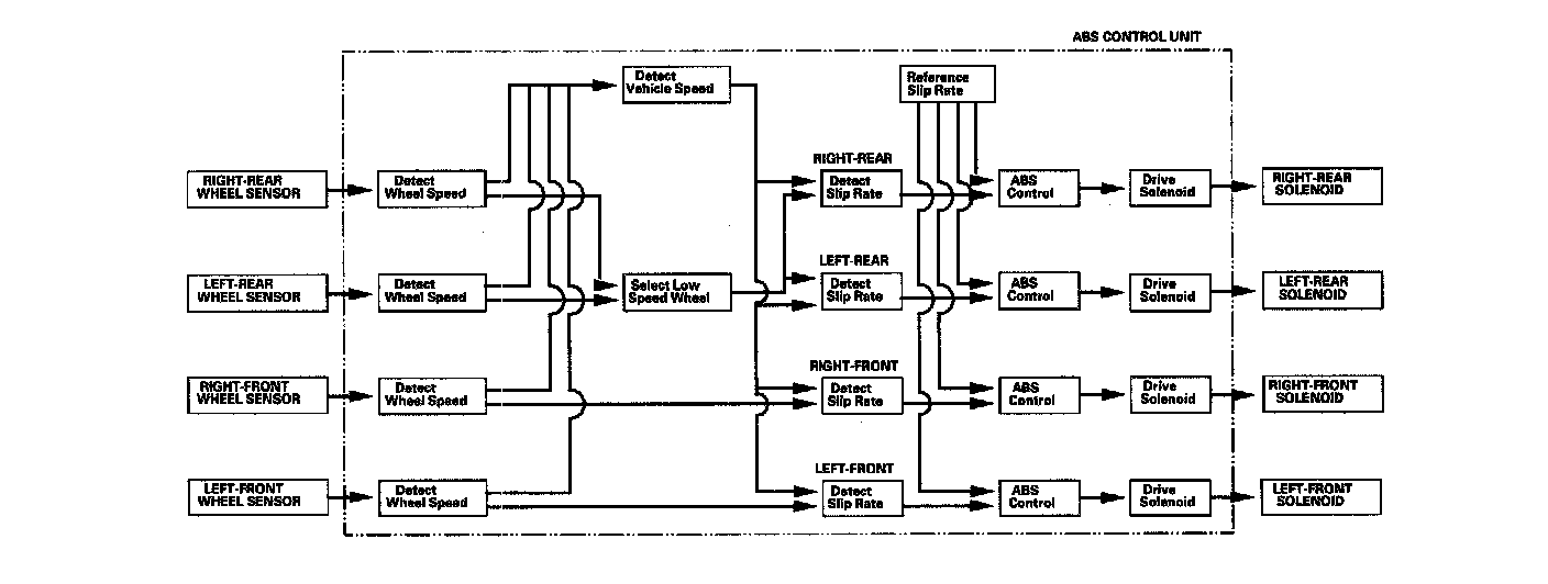 The ABS control unit calculates the slip rate of each wheel, and transmits the control signal to the modulator unit solenoid valve when the slip rate is high.