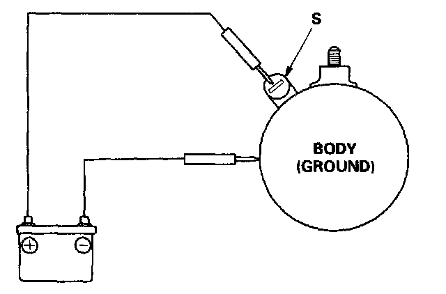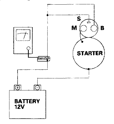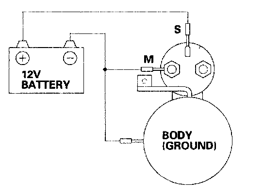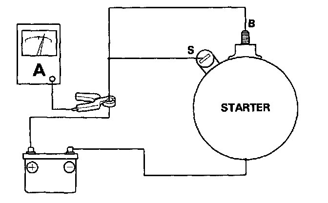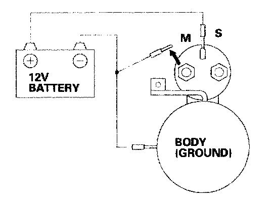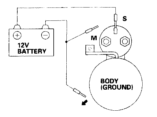 1. Connect the battery to the starter as shown using as heavy a wire as possible (preferably equivalent to the wire used for the vehicle). To avoid damaging the starter, never leave the battery connected for more than 10 seconds.