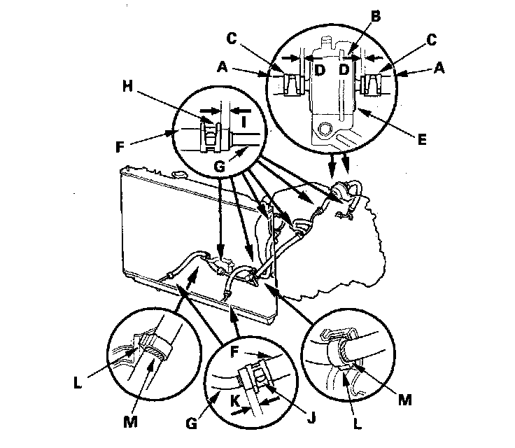3. Slide the ATF cooler hoses (F) over the ATF cooler lines (G).