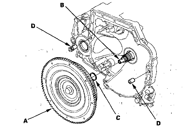 3. Install the 14 x 20 mm dowel pins (D) in the torque converter housing.