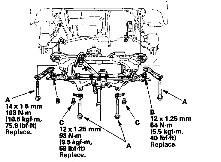 18. Loosely install the new subframe mounting bolts (A), and stiffener mounting bolts (B) (C).