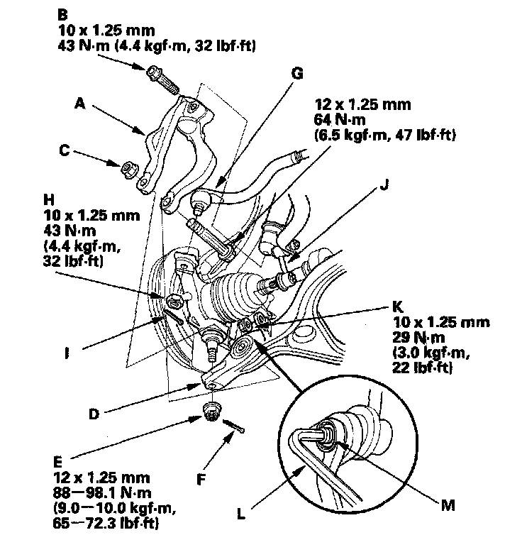 31. Install the stabilizer links (J) to the lower arms, and install the nuts (K). Insert a 6 mm Allen wrench (L) in the ball joint pin (M), and tighten the nuts.