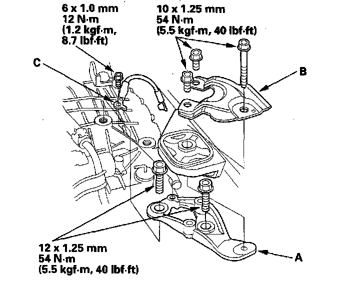 38. Install the transmission upper mount bracket (A), transmission upper mount bracket plate (B), and ground cable (C).
