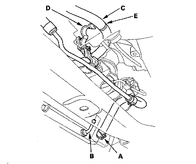 40. Install the ATF cooler hose (C) on the clamp (D), at the mark (E).