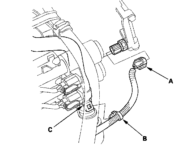 42. Connect the 3rd clutch transmission fluid pressure switch connector (A), and install the harness clamp (B) on the clamp bracket (C).