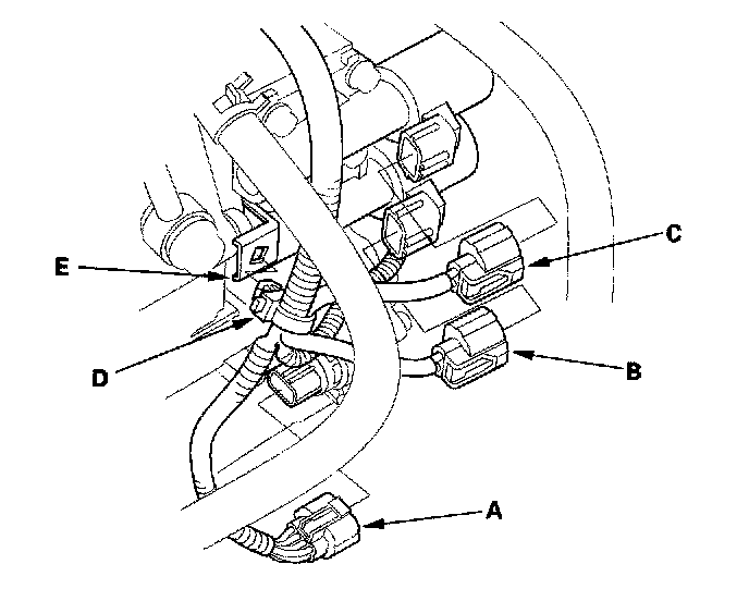 43. Connect the shift solenoid harness connector (A), A/T clutch pressure control solenoid valve B connector, and solenoid valve C connector, and install the harness clamp (D) on the clamp bracket (E).