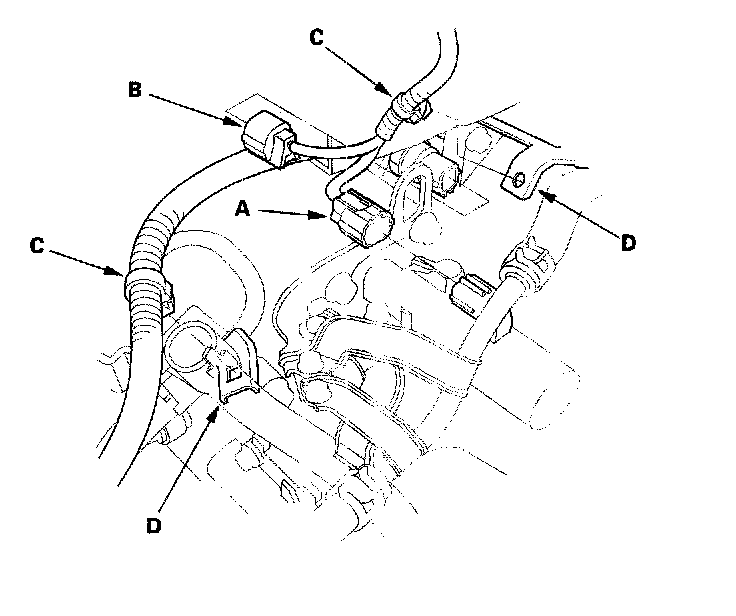 48. Install the A/T clutch pressure control solenoid valve A connector and 2nd clutch transmission fluid pressure switch connector (B), and install the harness clamps (C) on the harness clamp brackets (D).