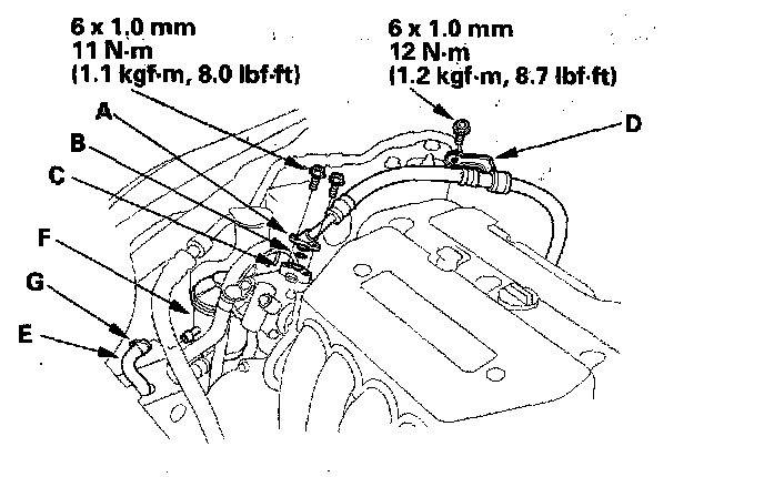 50. Connect the return hose (E) to the power steering fluid reservoir (F), then secure the hose with its clamp (G).
