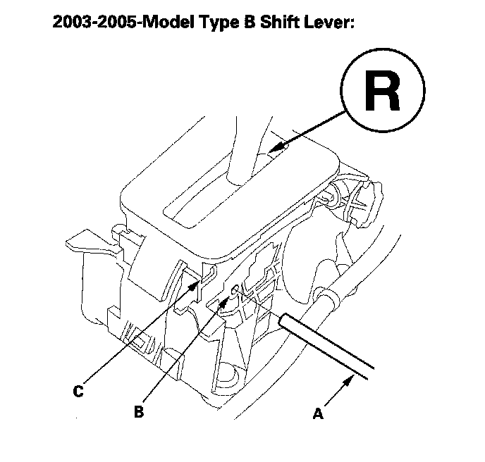 8. Insert a 6.0 mm (0.24 inch) pin (A) through the positioning hole (B) on the shift lever bracket base and into the positioning hole (C) on the shift lever. The shift lever is secured in the R position.